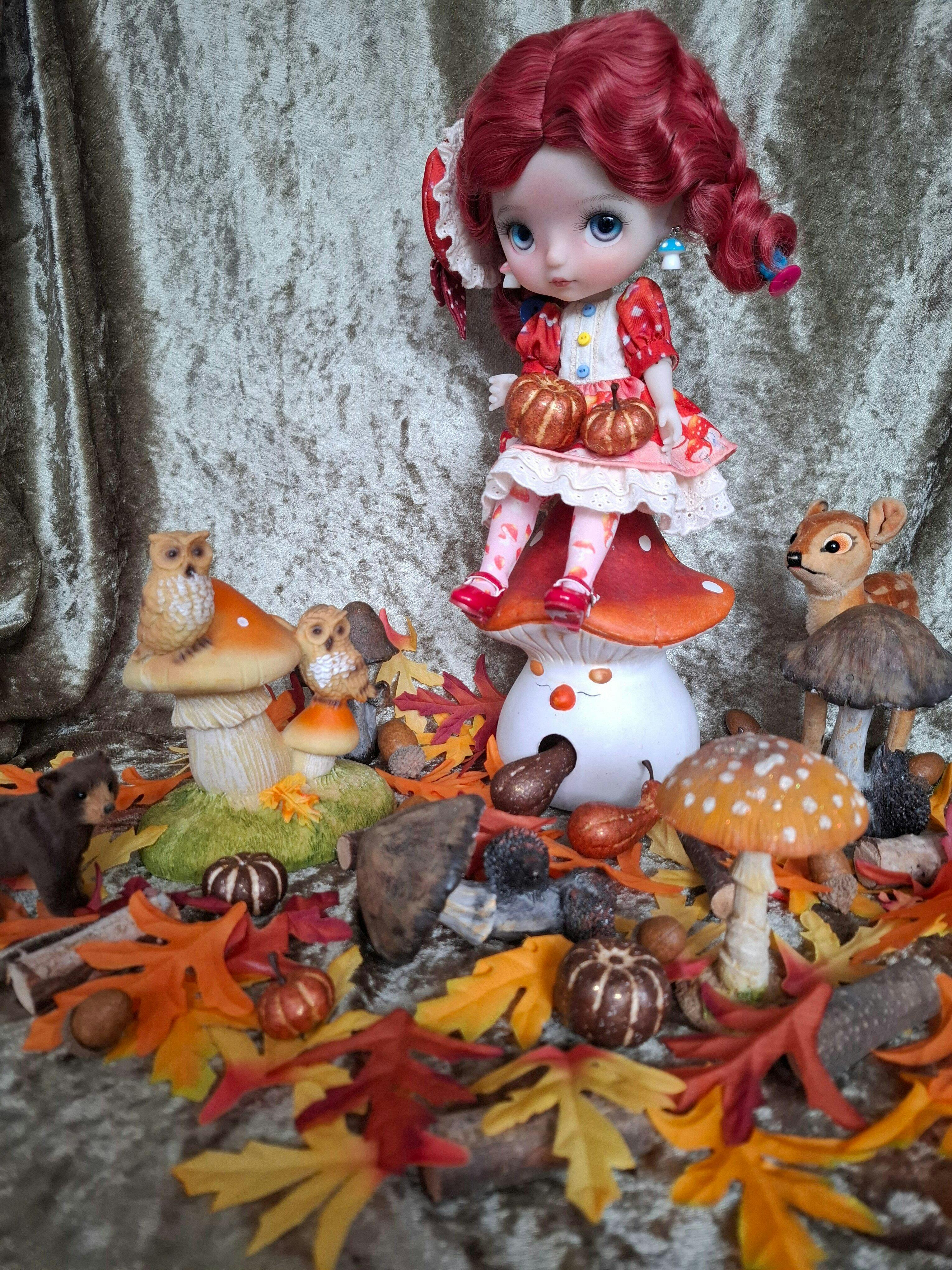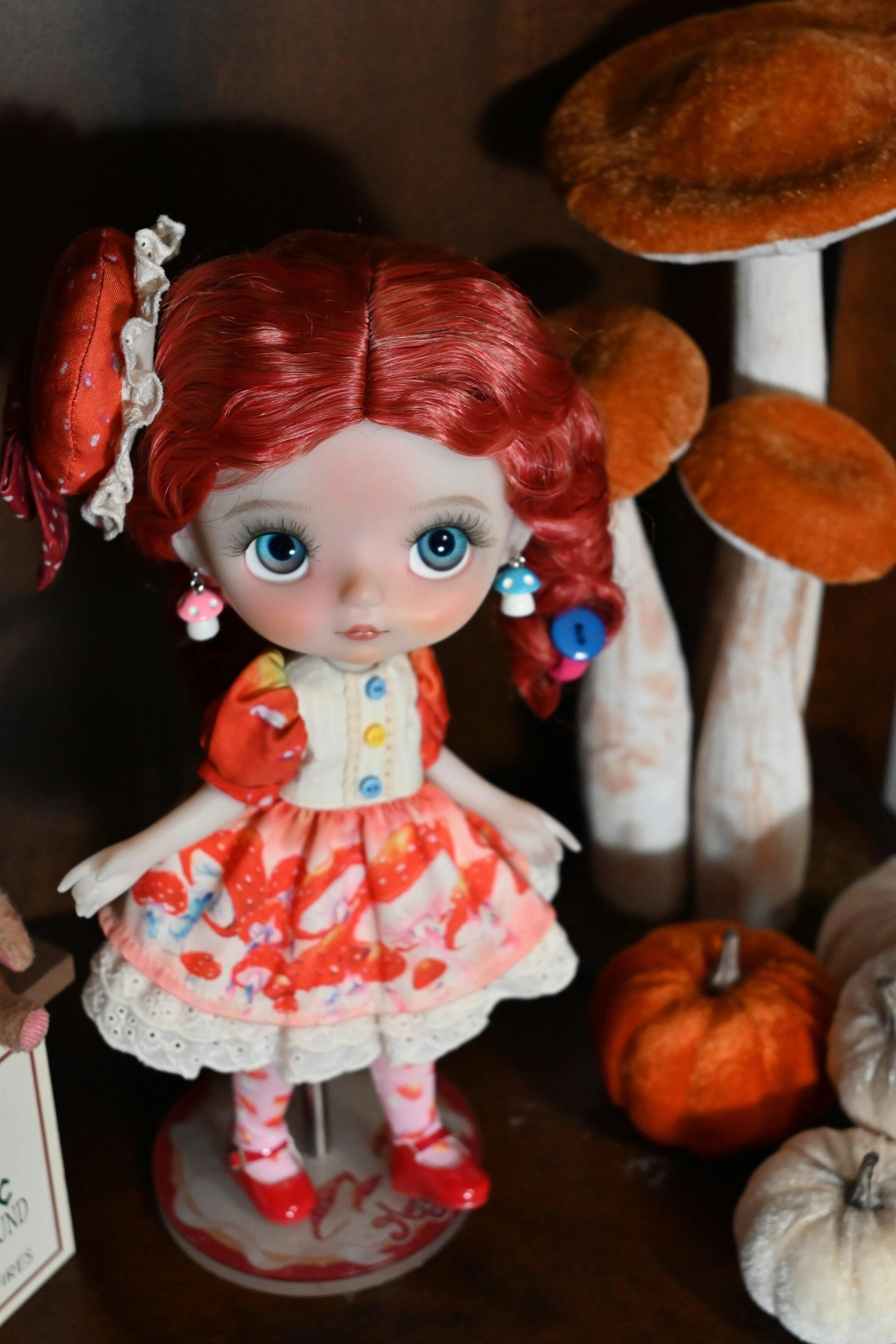 Dressed in a charming outfit adorned with delightful mushroom prints, she radiates a sense of joy and adventure. The intricate details of her dress, complete with colorful buttons and a sweet lace trim, make her a true collector's treasure. Her rosy cheeks and sparkling blue eyes invite you to explore the wonders of her fantasy realm.